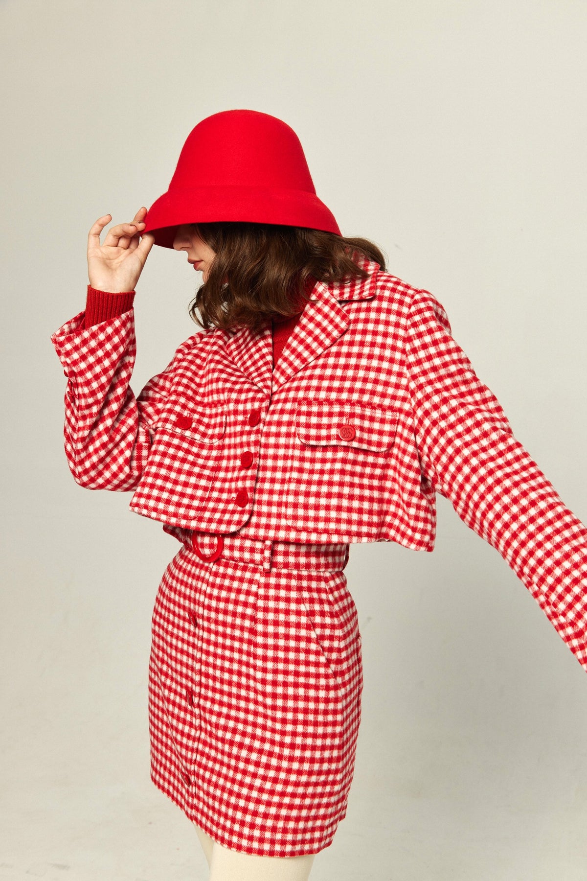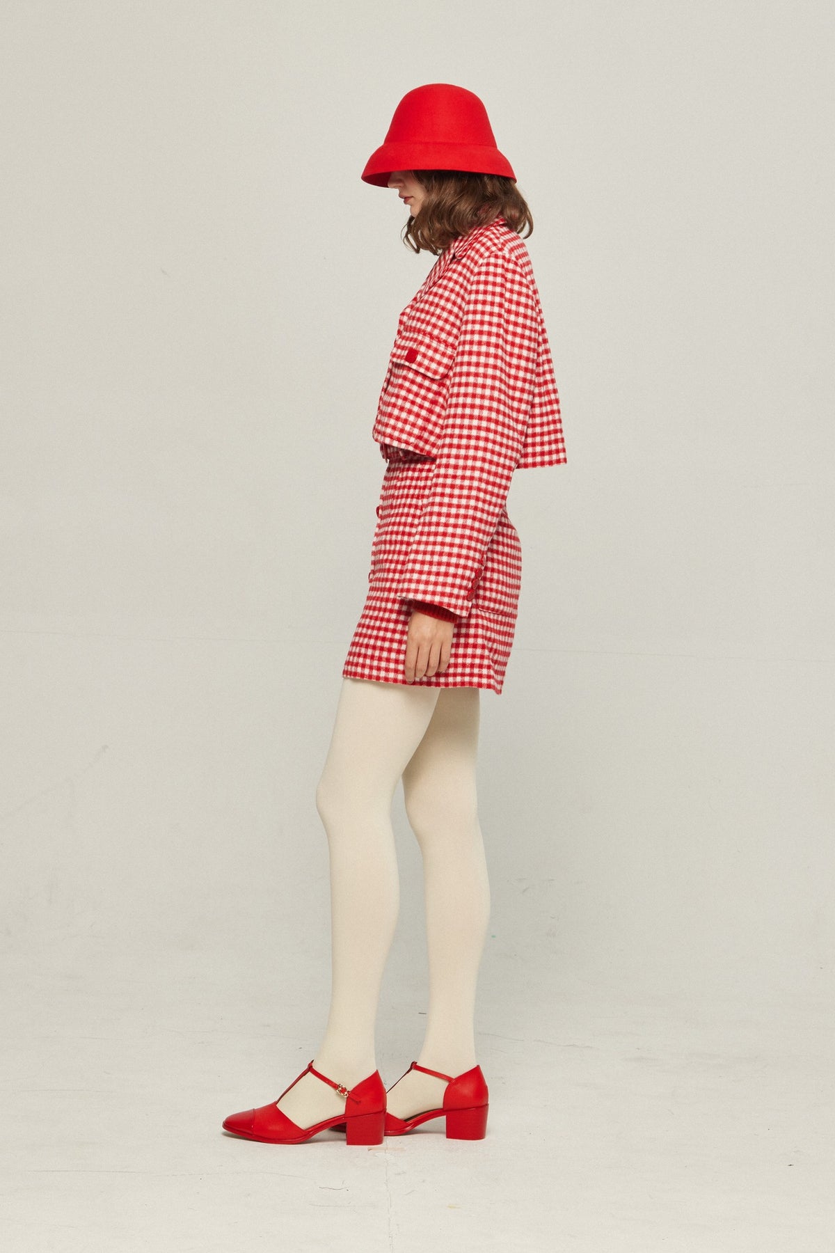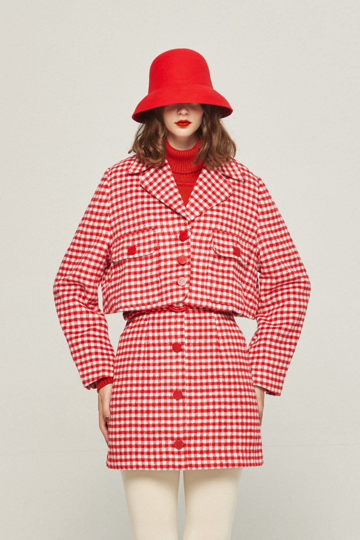 《ウィッグとサングラスをして》ギンガムチェックジャケット-Red