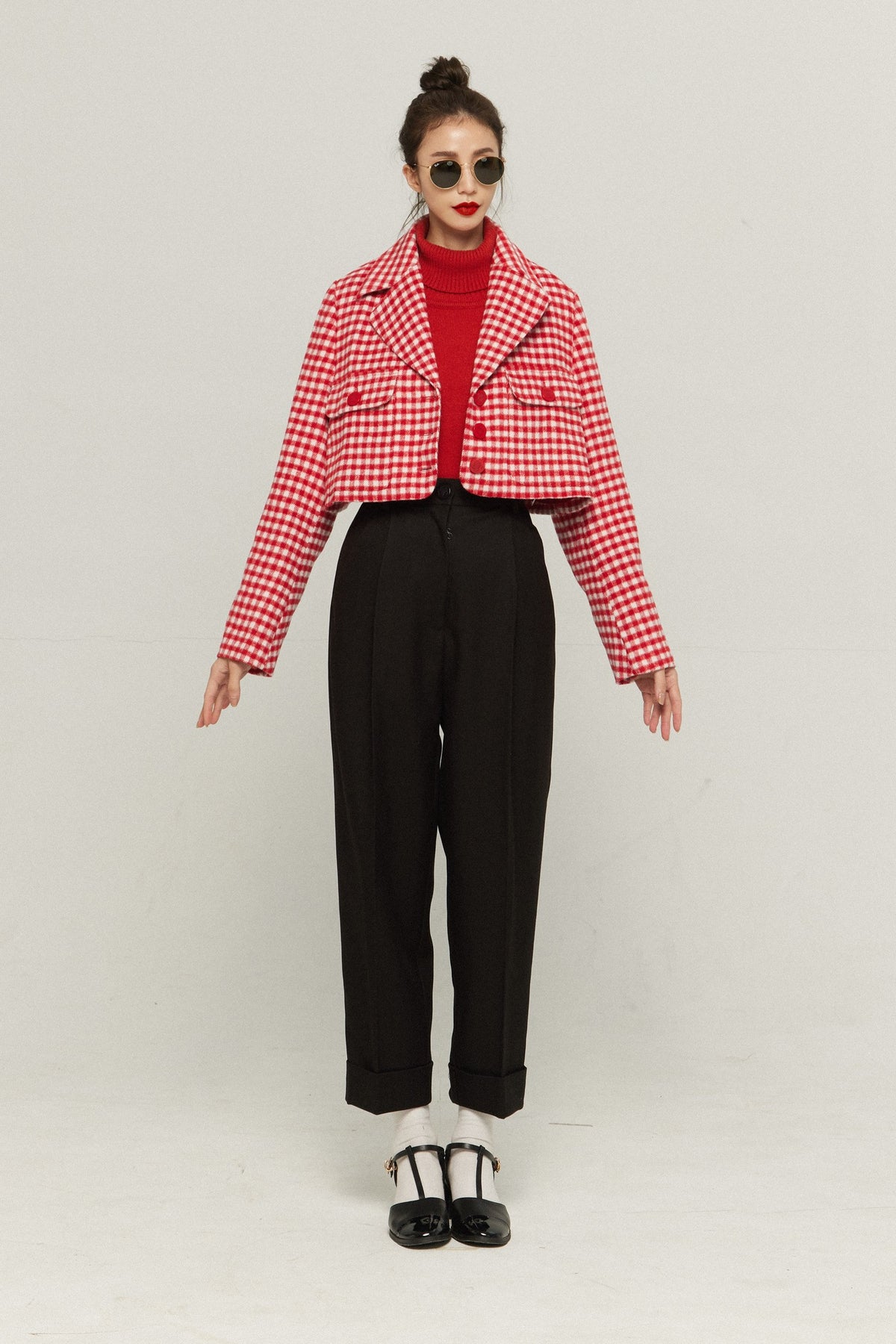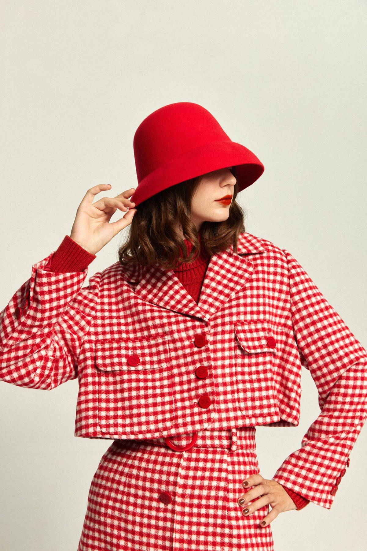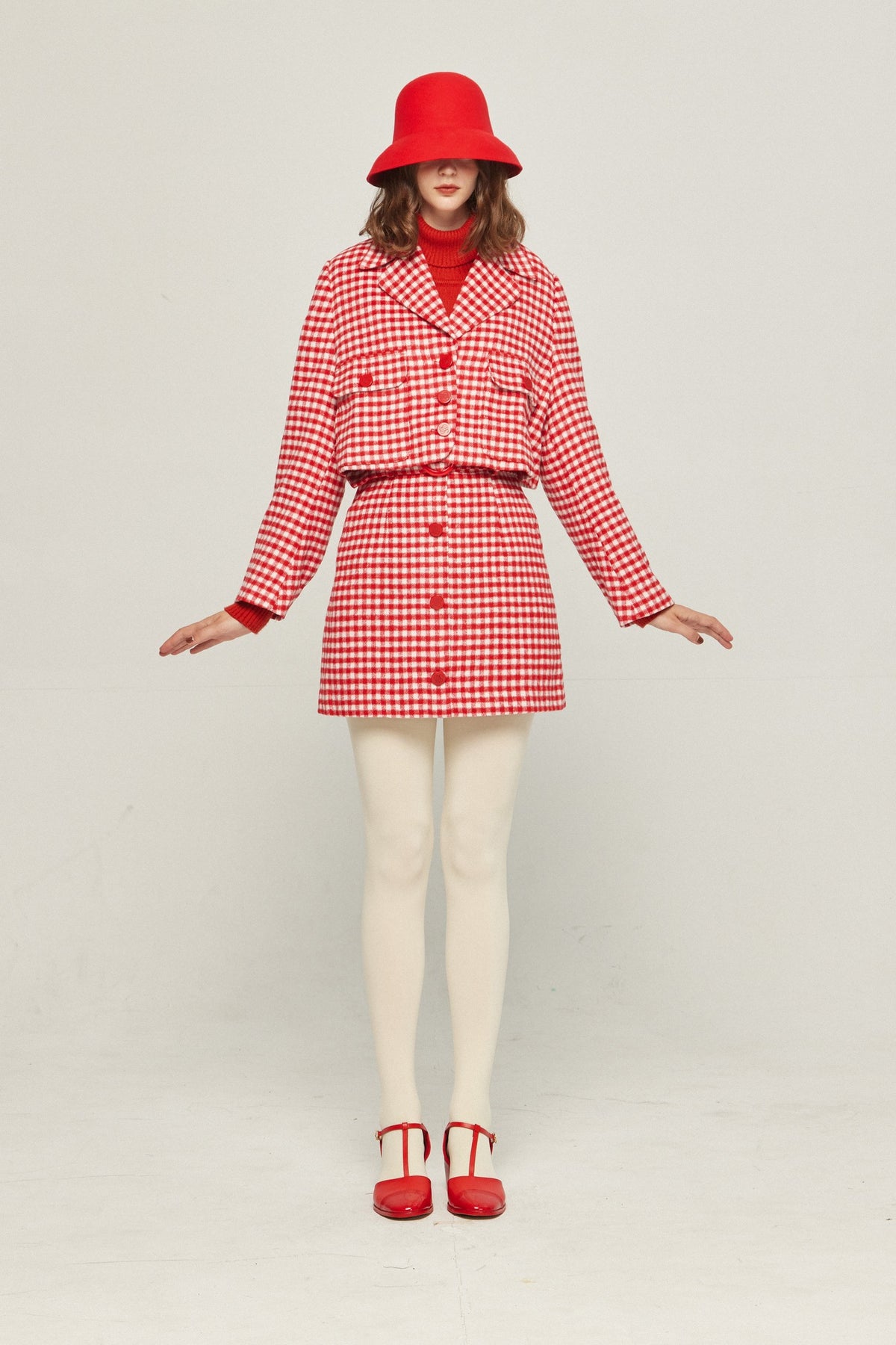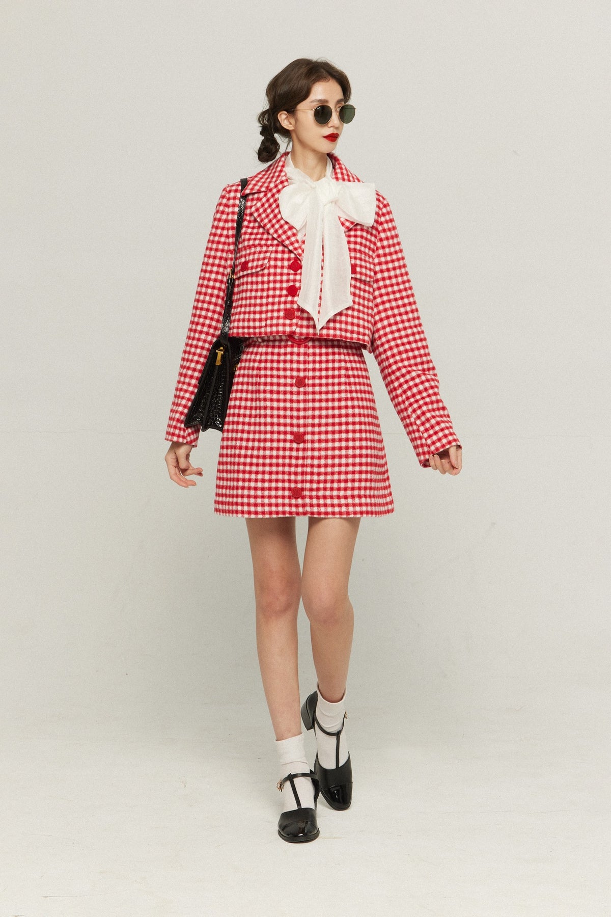 《ウィッグとサングラスをして》ギンガムチェックジャケット-Red
