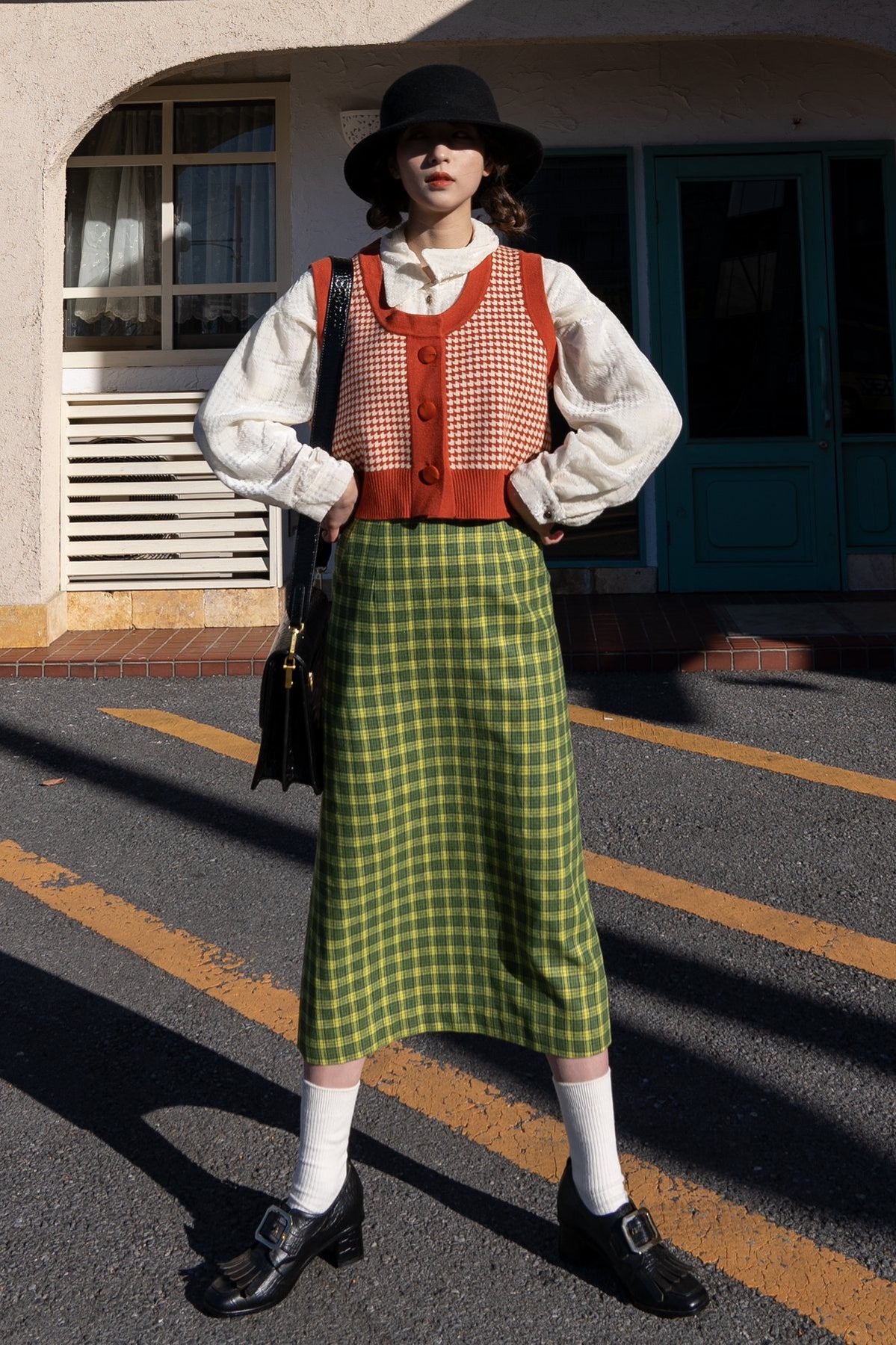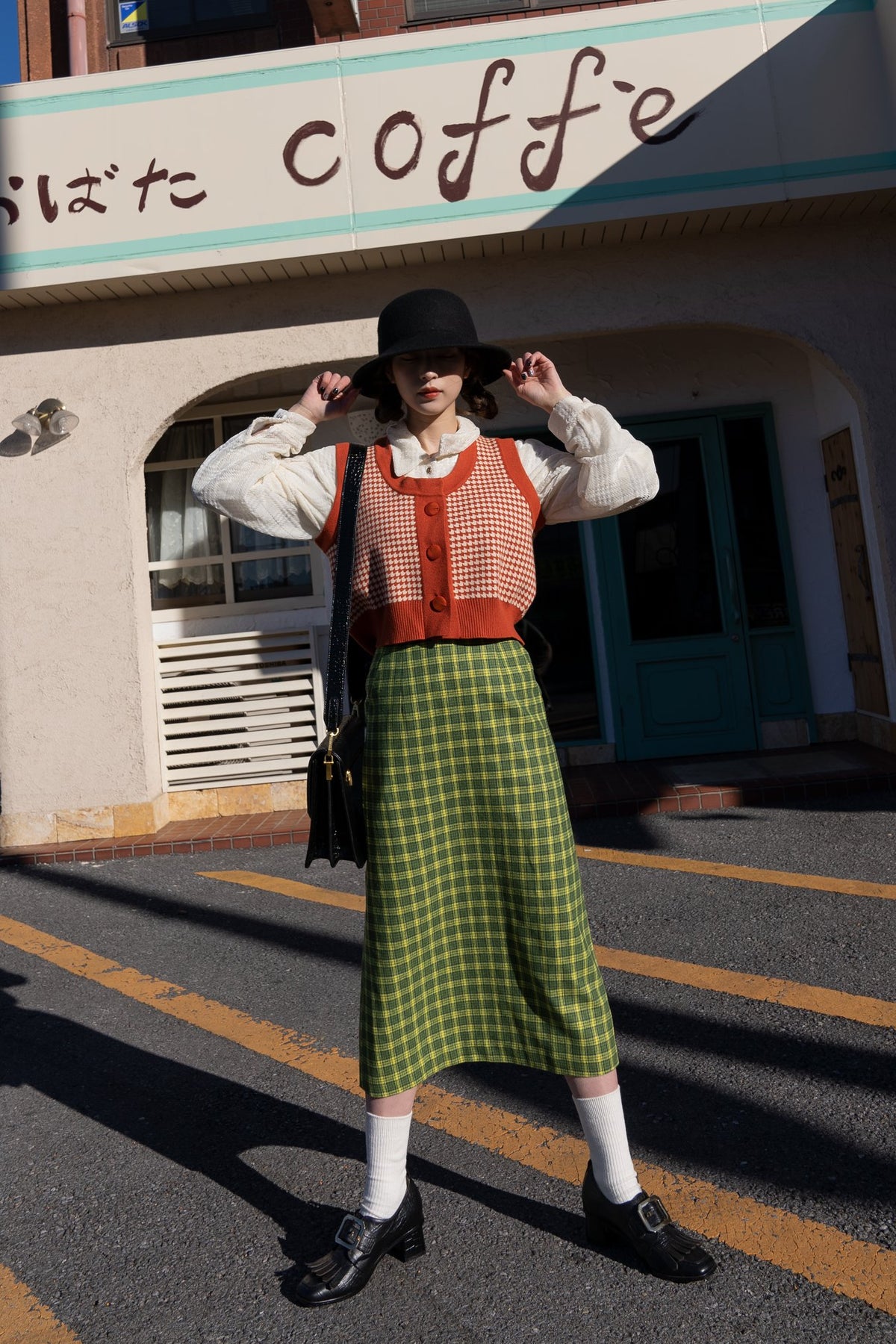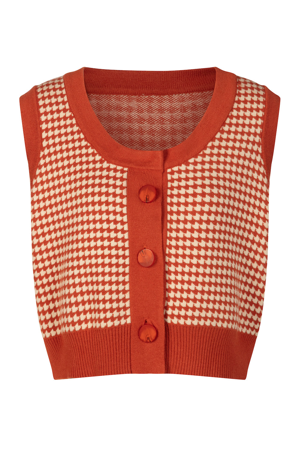 《壊れたフィルム》ハウンドトゥースチェックベスト-Orange red