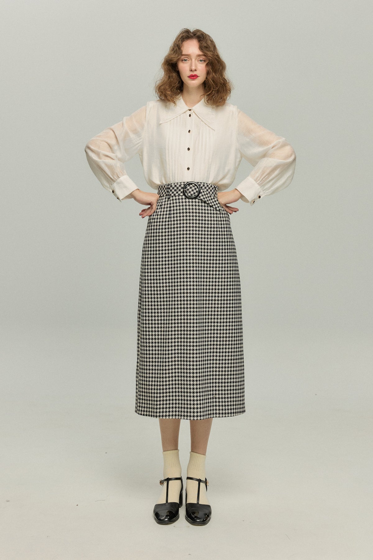 《エレベーターを長く待っている》ピンタックブラウス-White