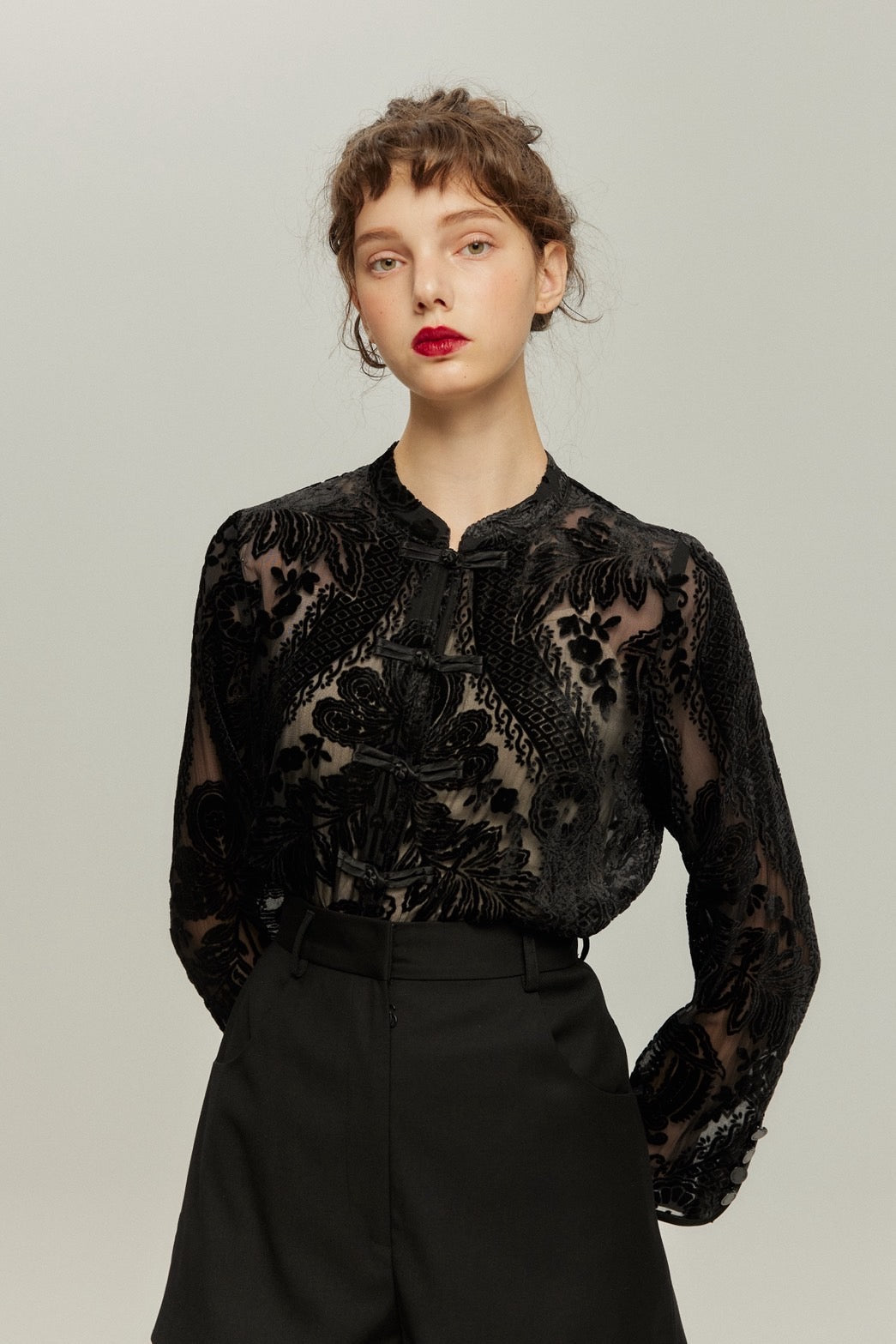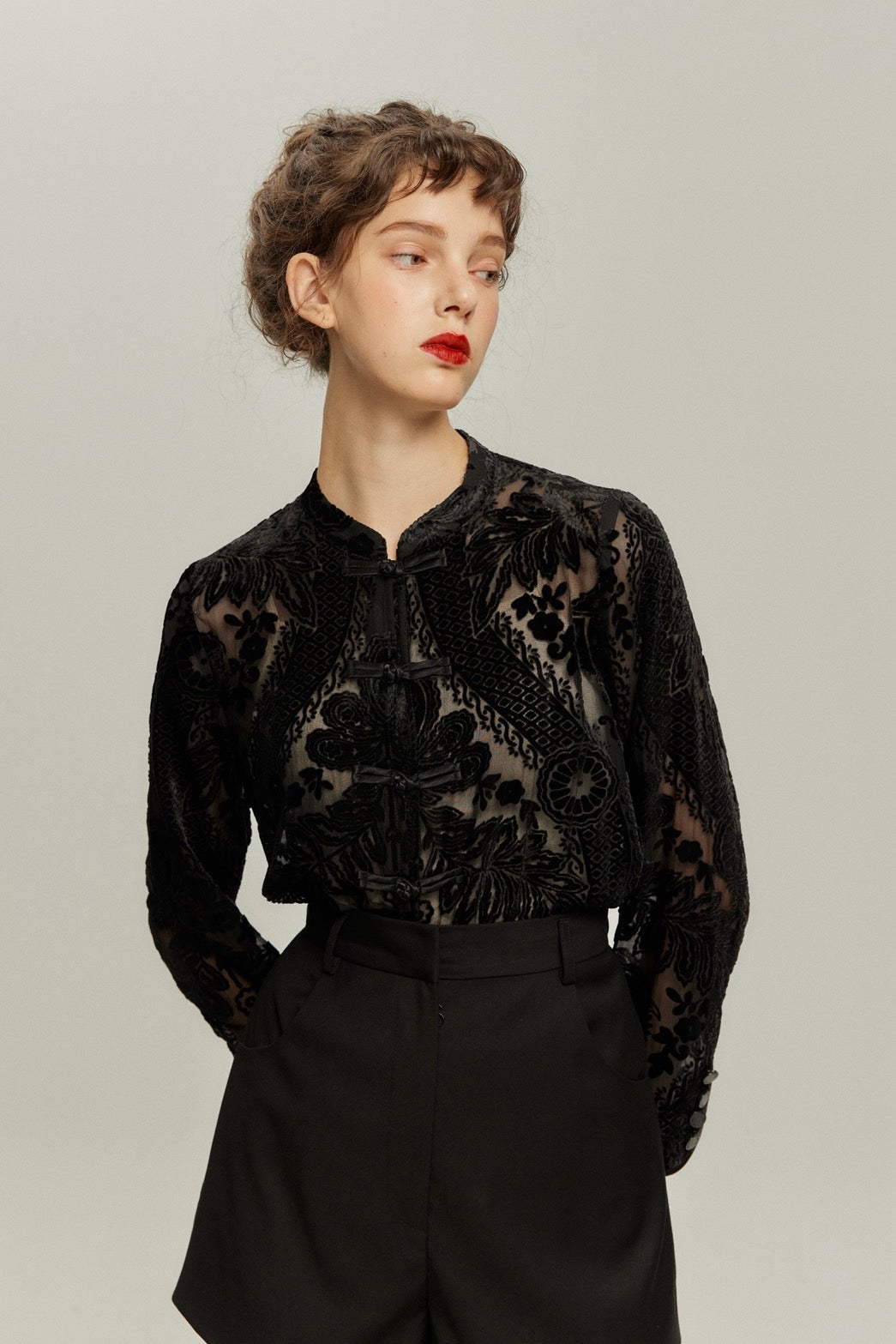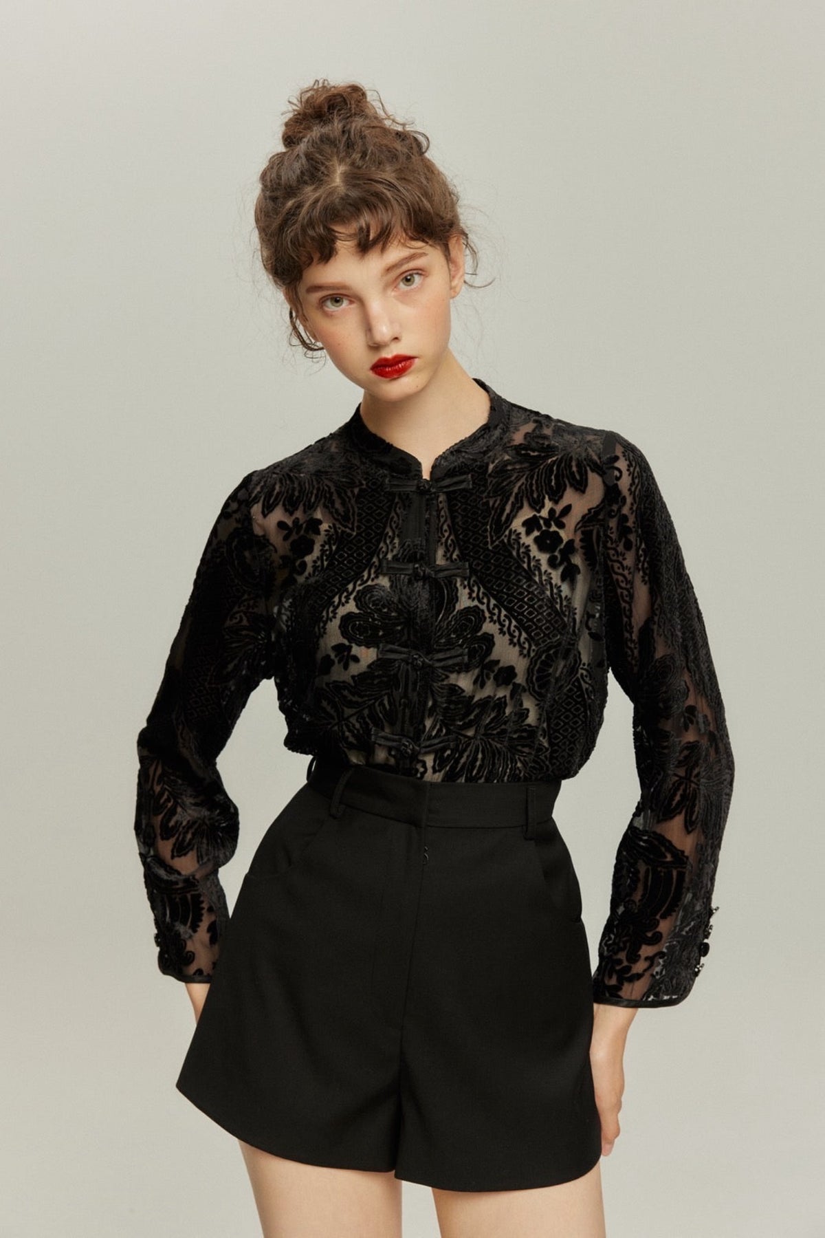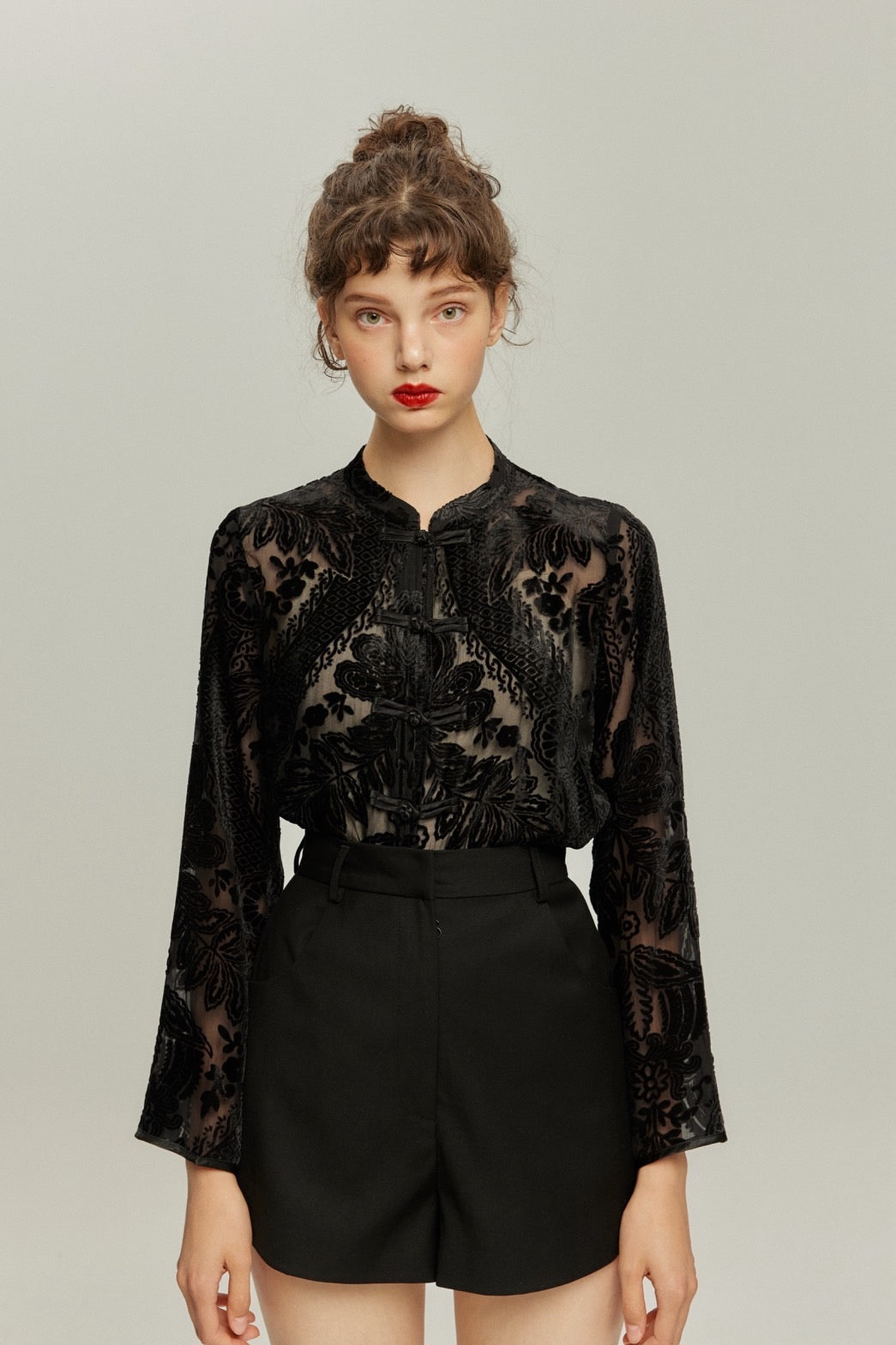 《茶葉でも占えます》チャイナバックルベルベットトップス-Black