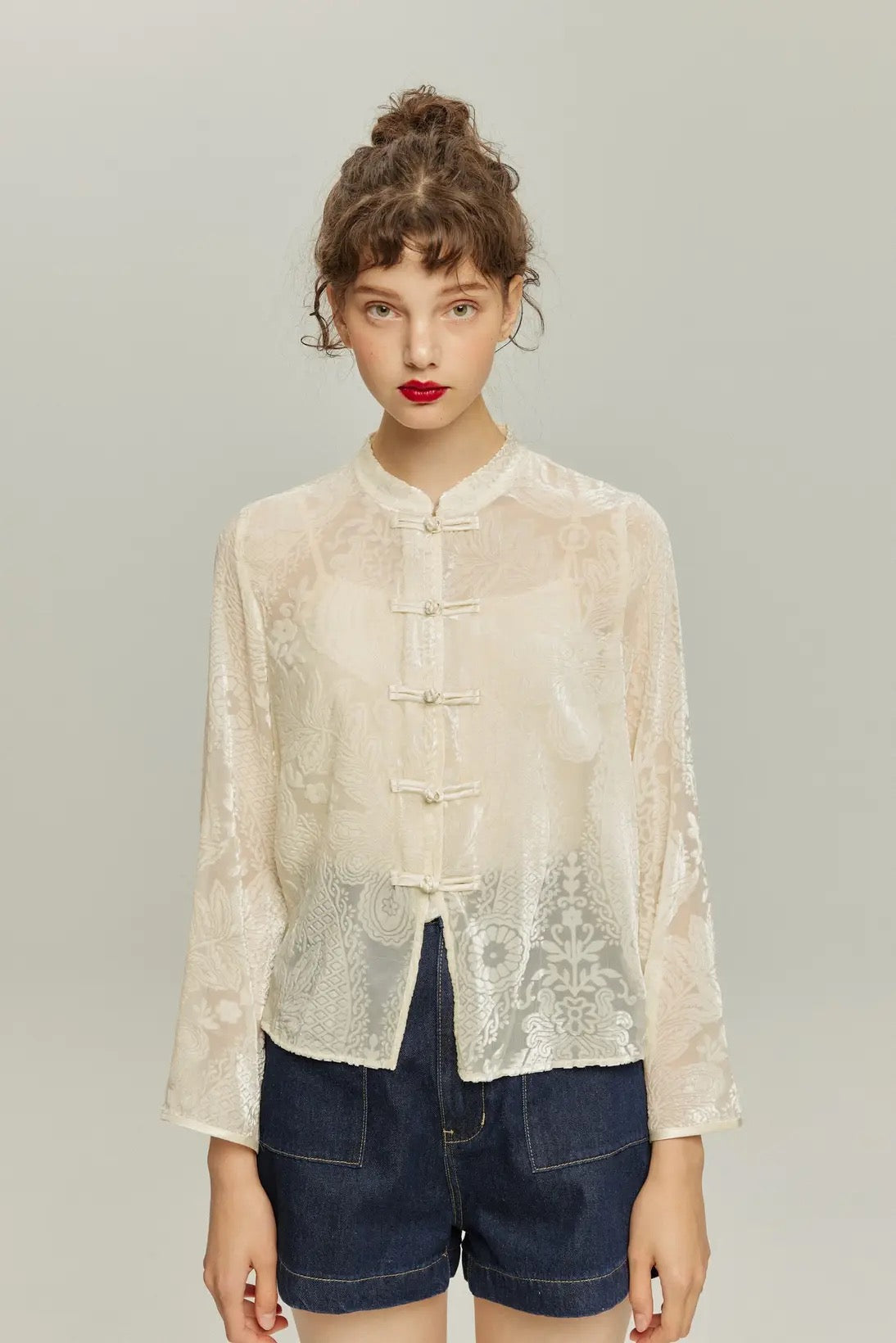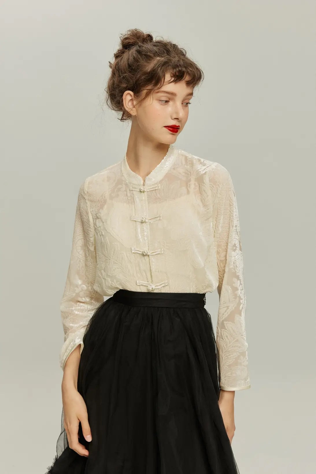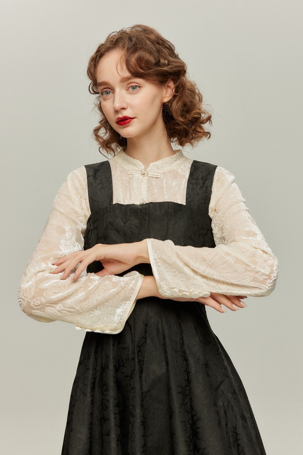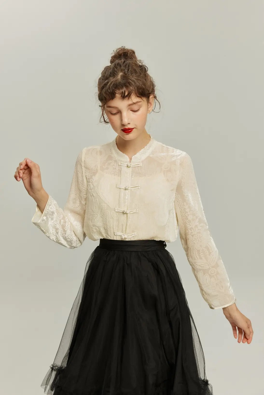 《茶葉でも占えます》チャイナバックルベルベットトップス-White